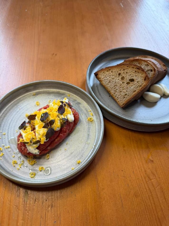 | TATARÁK Z HOVĚZÍHO ZADNÍHO, KONFITOVANÁ ŠALOTKA A ČESNEK, ŽLOUTKOVÝ GEL, ČESNEKOVÁ MAJONÉZA, SUCHÉ TOPINKY, ČESNEK | 229,- | |