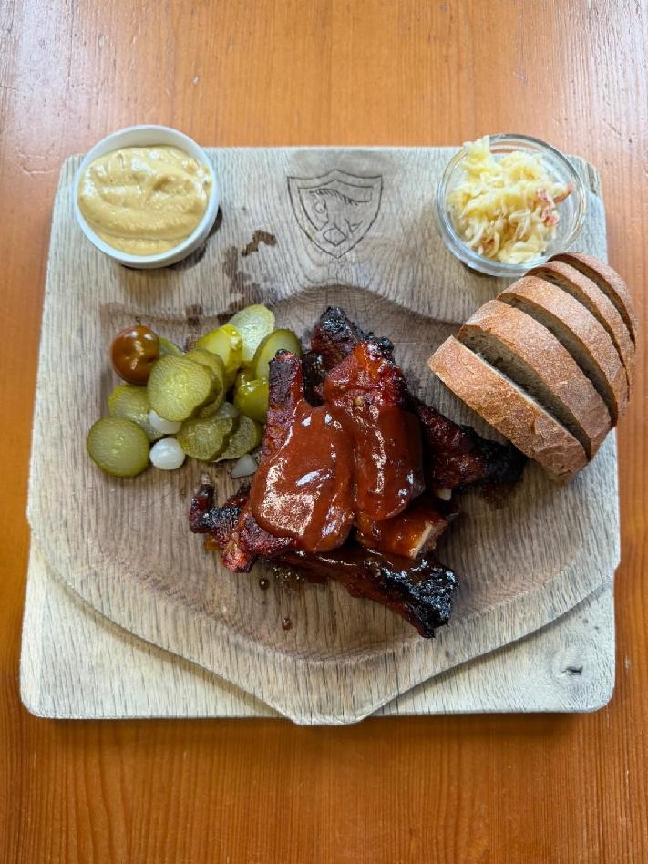 | VEPŘOVÁ ŽEBRA V PIVNÍ MARINÁDĚ S NAŠÍM ROZPEČENÝM CHLEBEM, VEJMRDOU A HOŘČICÍ | 315,- | ||||||||