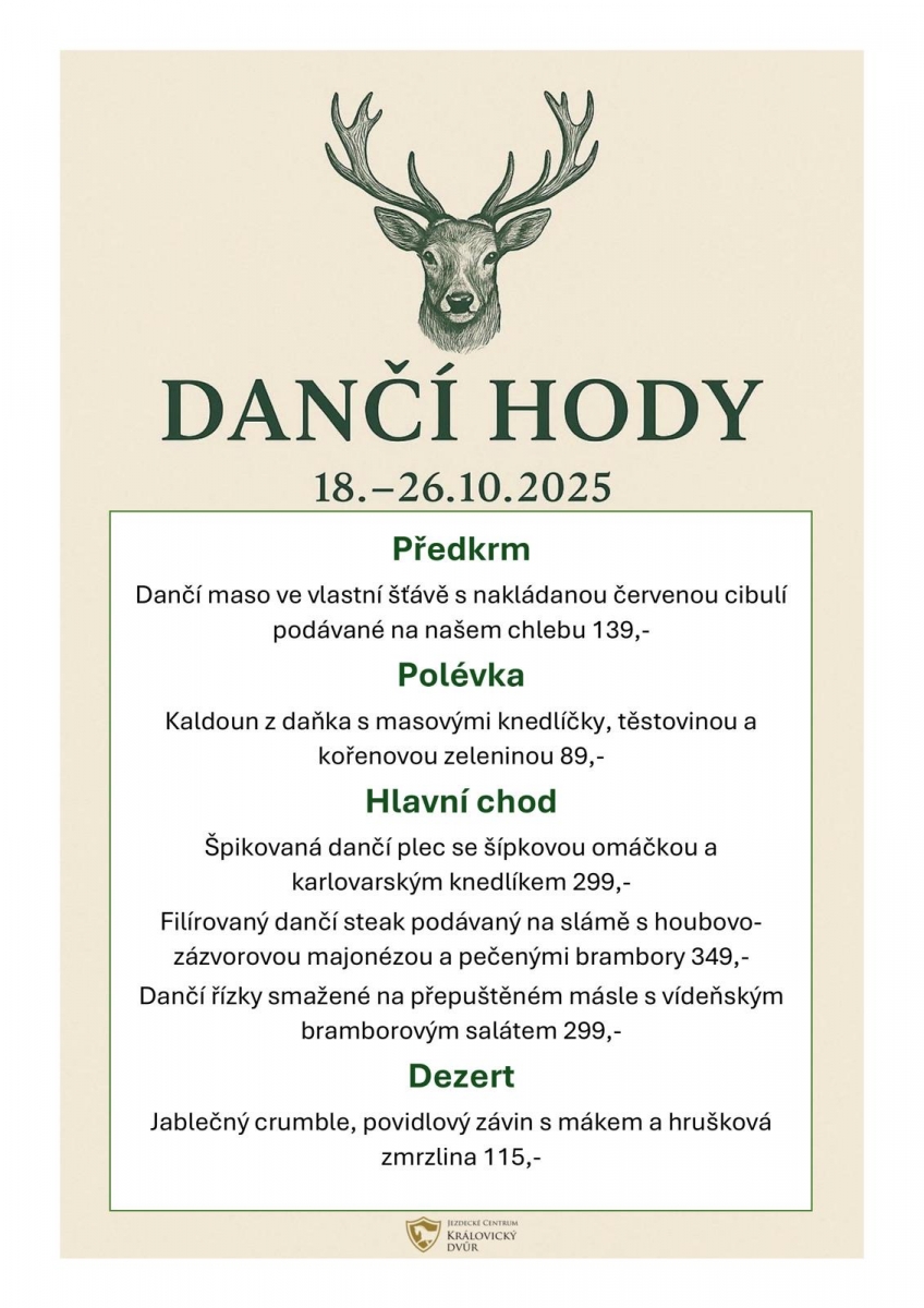 Přijďte si vychutnat podzimní speciality z dančího masa, projít naučnou dančí stezku s kvízem a malým dárkem a také zahlédnout koně a daňky ve volném výběhu.