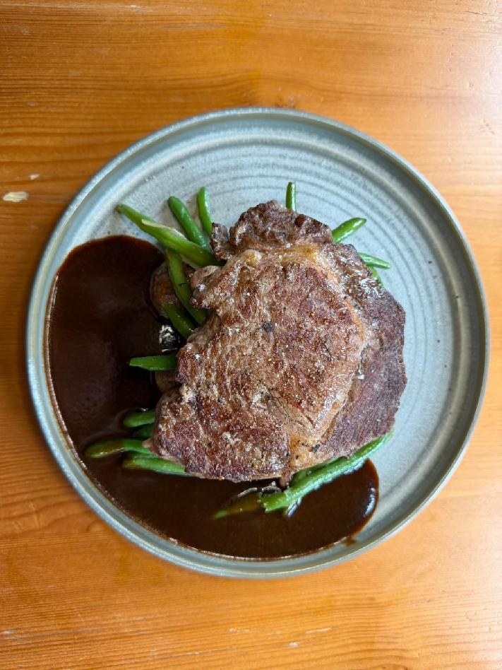 | HOVĚZÍ STEAK S FAZOLKAMI NA SLANINĚ, RESTOVANOU CIBULKOU, GRENAILLE A OMÁČKU Z PORTSKÉHO VÍNA | 529,- | ||||||||