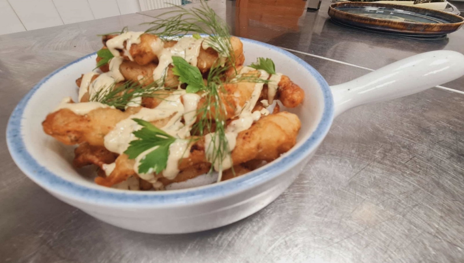Křupavé kapří hranolky , podávané s jemnou majonézou z lesních hub.